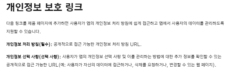 구글 플레이 스토어 앱 배포 과정에서 개인의 정보를 서버에 저장하게 되면 개인정보처리 방침에 관련된 사항을 명시해야 한다.